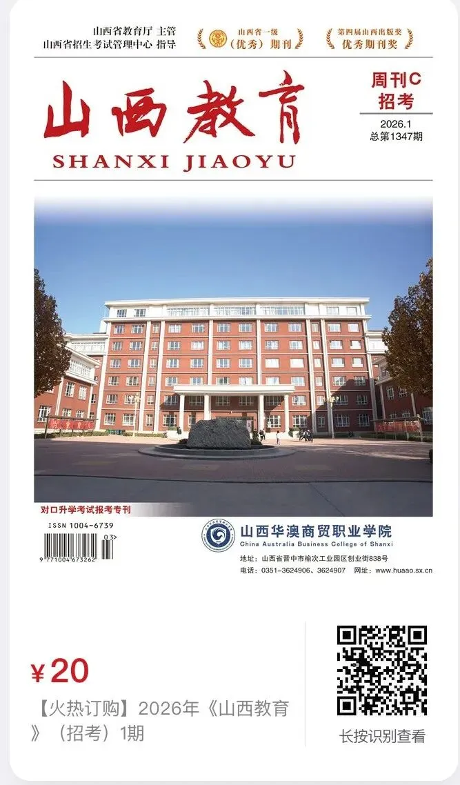 《山西教育》(招考)2026年1期对口升学考试报考专刊内含语文、数学、英语各5套模拟试题,共计15套试题,以及报考政策等资讯,可助力考生明确招生政策、提升答题能力。扫码即可订购:《山西教育》周刊C(招考)杂志是山西省唯一一份面向广大山西考生的招生考试类权威期刊。本刊官方微信公众平台发布高考、成考、自考和对口升学、专升本、研究生考试等各类招考权威信息。