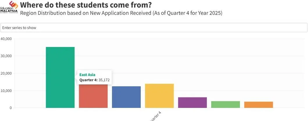 根据马来西亚全球教育服务中心的数据,2025年,马来西亚国际学生新申请总量突破95,000份,而中国以31,866份申请量位居首位,成马来西亚最大国际生源国。申请人数的大幅增长,使学校在招生时拥有更大的选择余地,门槛随申请热度水涨船高成为自然结果。