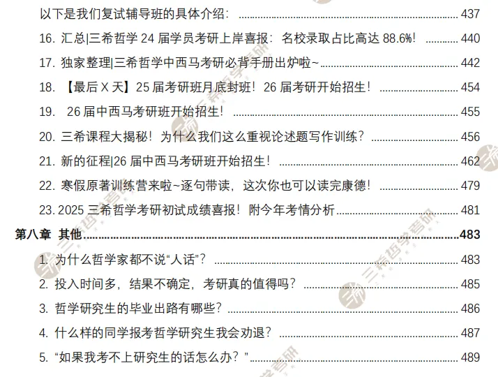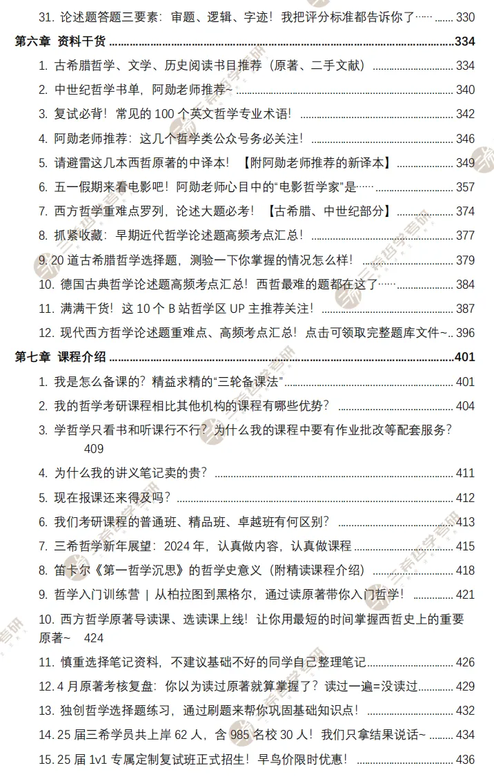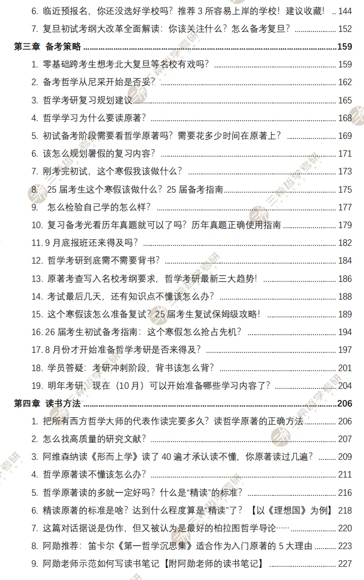 文档按照不同的主题分类,分别有:1、哲学知识点答疑,2、择校相关,3、备考策略,4、读书方法,5、经验分享,6、资料干货,7、课程介绍还有,8、其他。