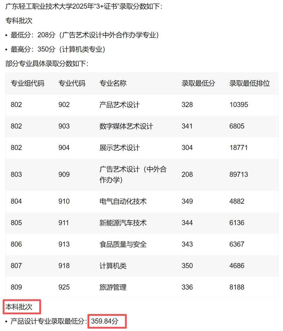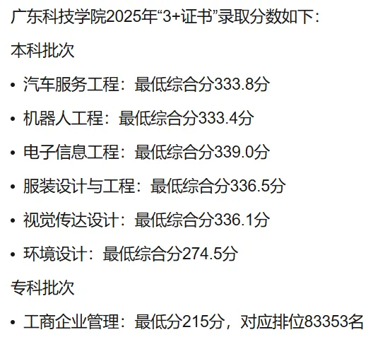 一、韩山师范学院(公办本科)韩山师范学院2025年“3+证书”本科招生的录取分数如下:产品设计专业:综合成绩录取最低分为356.16分烹饪与营养教育专业:综合成绩录取最低分为356.06分酒店管理专业:综合成绩录取最低分为328.66分社会工作专业:综合成绩录取最低分为341.10分二、嘉应学院(公办本科)三、岭南师范学院(公办本科)四、广东技术师范大学(公办本科)五、韶关学院(公办本科)六、深圳职业技术大学(公办本科)七、广东轻工职业技术大学(公办本科)八、广东白云学院(民办本科)九、广州科技职业技术大学(民办本科)十、广东科技学院(民办本科)十一、广东工商职业技术大学(民办本科)