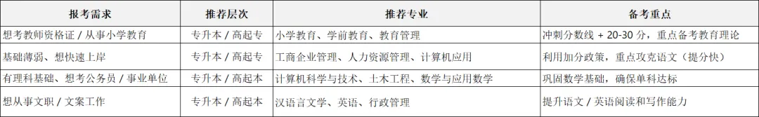 1. 误区:分数线低=专业差——理工/经管类分数线低,不代表含金量低,反而因实用性强,在企业招聘中需求大;2. 误区:热门专业必选——小学教育虽好,但基础差强行报考易落榜,可选教育管理等同类分数稍低的专业替代;3. 误区:跨科类报考易上岸——文科生考理工类,虽分数低但数学是短板,可能单科不达标,建议“顺势而为”选匹配基础的科类。三、不同需求的“上岸专业”速查表