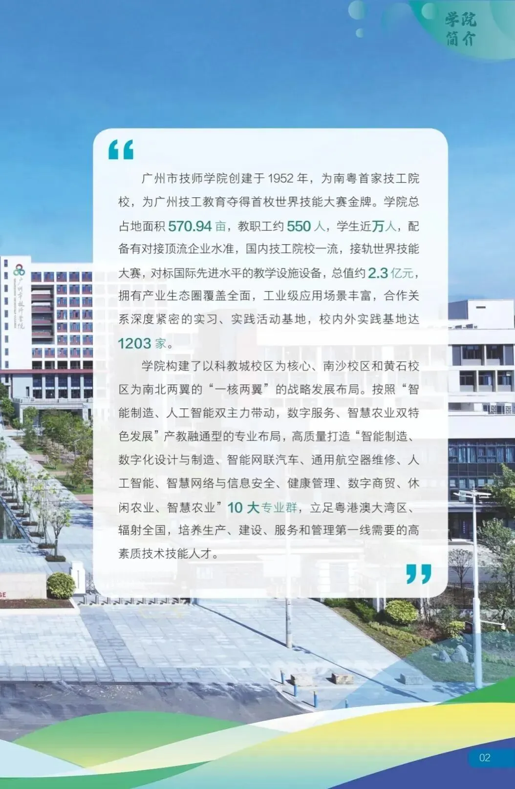 广州市技师学院创建于1952年,为南粤首家技工院校,为广州技工教育夺得首枚世界技能大赛金牌。学院总占地面积570.94亩,教职工约550人,学生近万人,配备有对接顶流企业水准,国内技工院校一流,接轨世界技能大赛,对标国际先进水平的教学设施设备,总值约2.3亿元,拥有产业生态圈覆盖全面,工业级应用场景丰富,合作关系深度紧密的实习、实践活动基地,校内外实践基地达1203家。