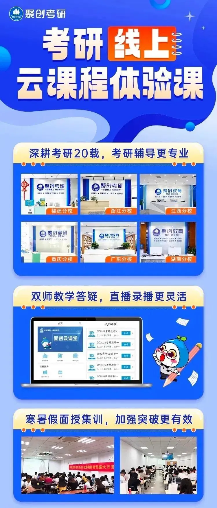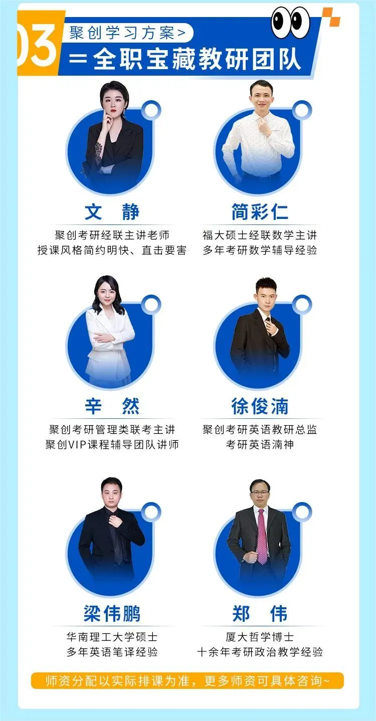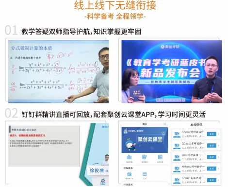 咱们聚创考研有辅导考研十几年的师资团队专门讲解各统考科目,包括该科目的重点难点、考点、方法技巧等。最新的考试大纲发布后,zui忙的也是咱们老师了,加班加点把改革后zui新的考点内容和教研大纲安排进来,及时更新课程。