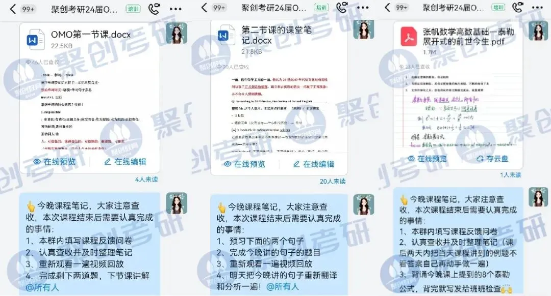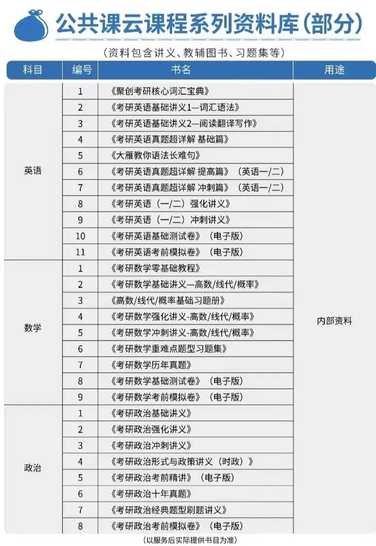 不仅是课程,咱们也会分发跟课程配套的必要的学习资料,如讲义、真题、复习必备书等,这些都是经过聚创考研教研组的老师们多次优化的!除此之外,还有咱们聚创考研内部研发的资料,配合课程的学习达到更佳的效果。