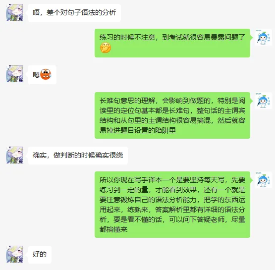 如果你压力太大,学习状态不好,班主任也会及时给予你心理疏导,与你进行朋友般约聊,为你疏导压力,调整好学习状态。