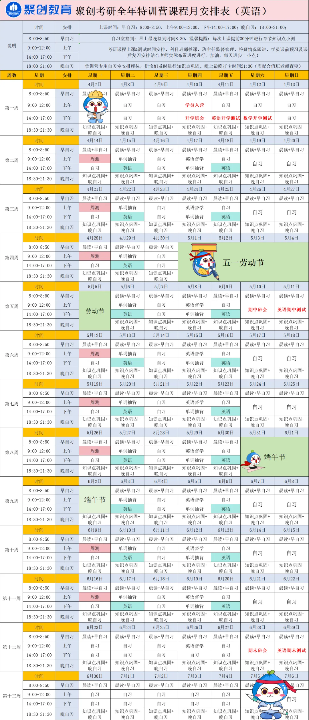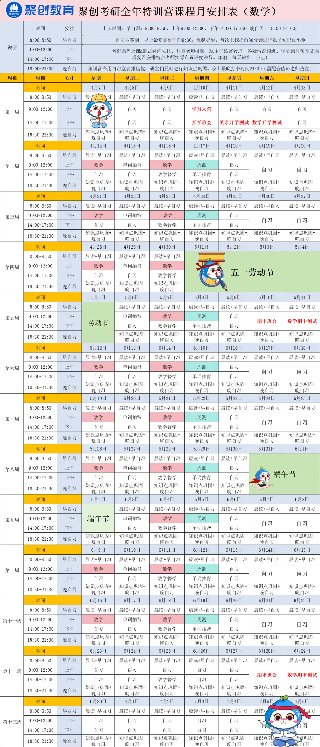 选择好的辅导资料等于成功了一半。我们全程为大家分阶段提供市面优质的辅导书籍和聚创考研内部高端教辅资料。比如英语词汇、英语真题讲义、数学习题集、典型重点题集、真题集、考试分析手册等等。聚创考研集训营每天都有紧密的课程安排,早自习+上课+测评+练习+答疑...,备考细化到分秒必争,24小时标准化作息,全身心投入,每天都是高效的复习和提升状态。