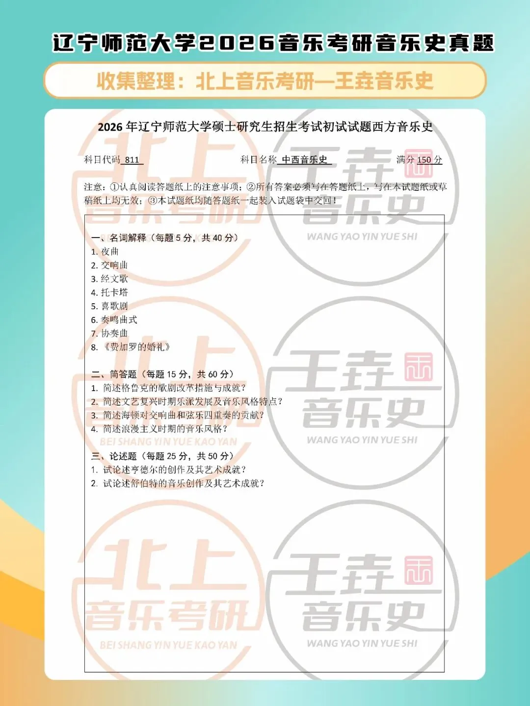 辽宁师范大学音乐史2026音乐考研音乐史真题|北上音乐考研-王垚音乐史工作室收集整理