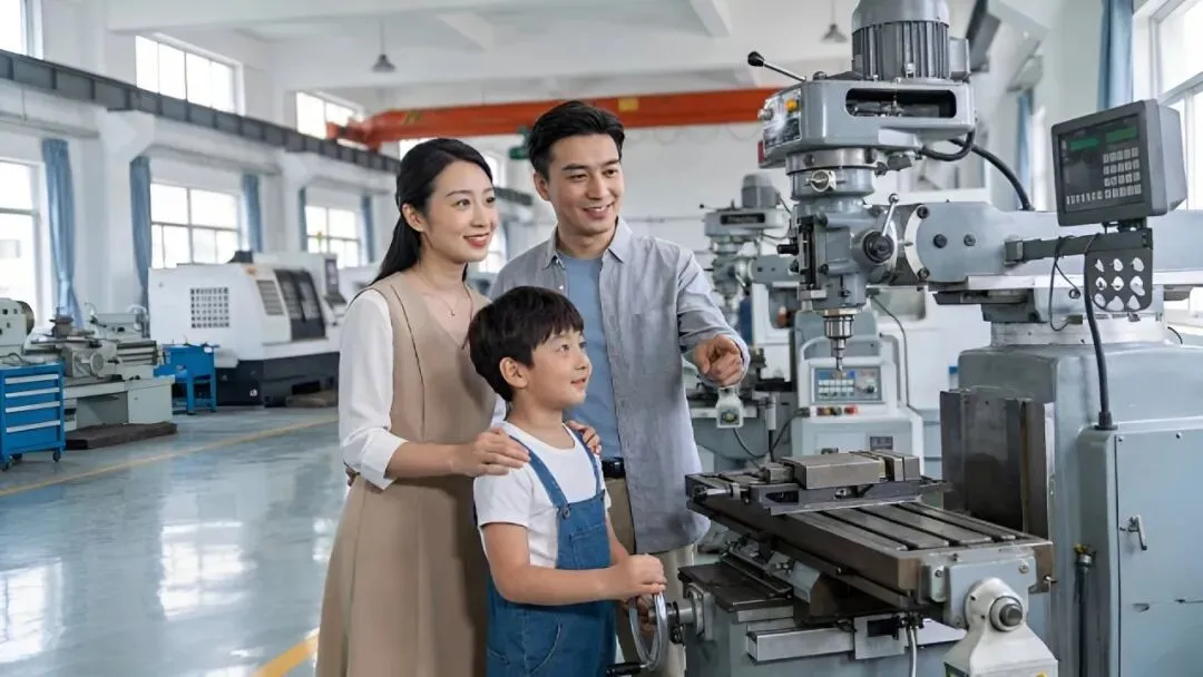 一家人参观高职院校实训基地,孩子饶有兴致地看着设备
