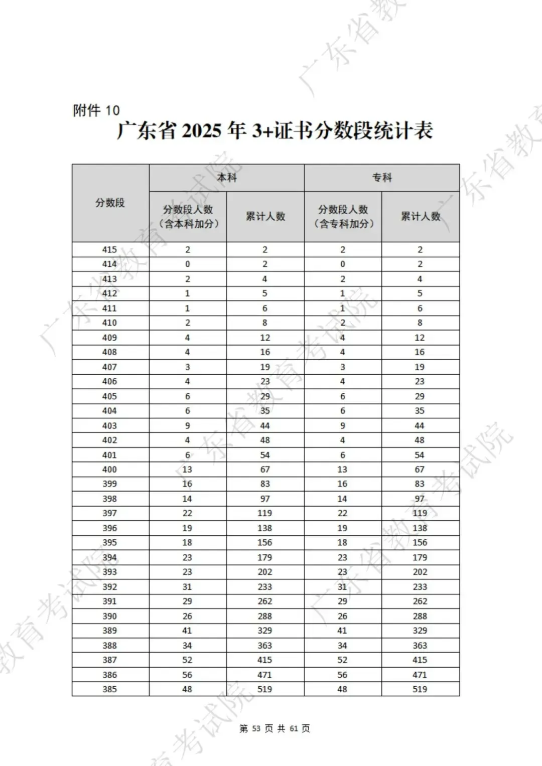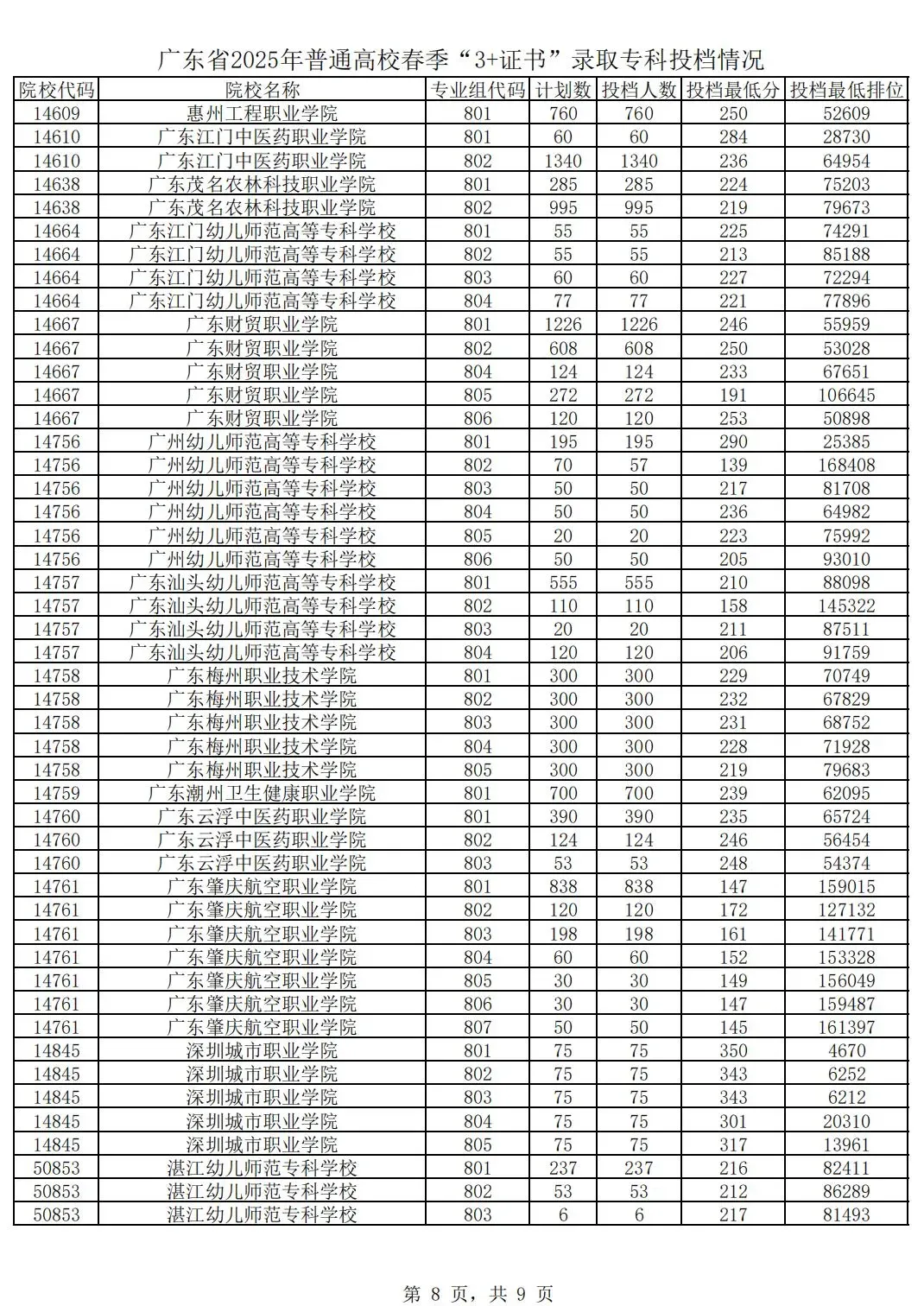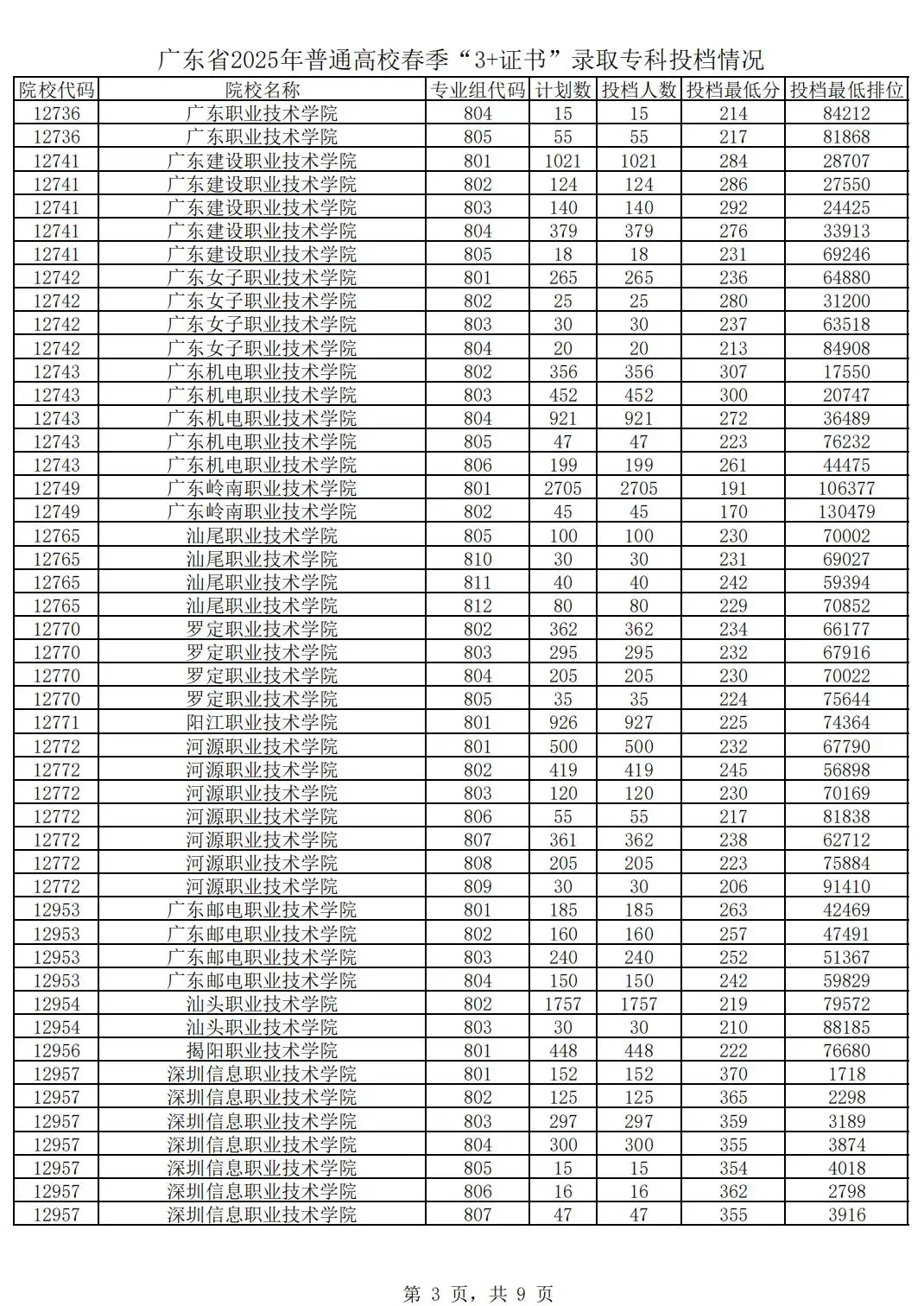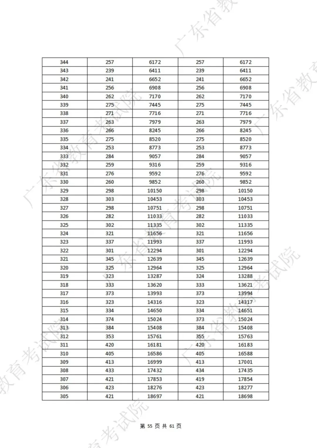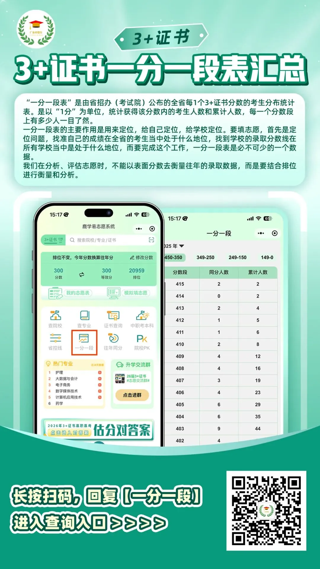 如果只是简单地参考去年的院校录取分数的话。很有可能会不准确,这个时候怎么办?同学们可以参照最低排位。如下图:在每年公布的院校分数线里都有一个最低排位。这里的最低排位就是指,该年所录取的排位最低的一个同学。虽然刚刚的讲的方法可以让你直接的参照到往年院校的最低排位,但是毕竟不直观。你很难去判断,你要稳上某所院校的话需要多多少排位。毕竟排位两千的时候,排位高一千。和排位两万的时候,排位高一千是完全两个概念的事。所以,我们要学会借助分数段将今年的分数大概换算成往年的分数。例如:你今年的排位是一万,那么你就要去25年的分数段里,找到25年一万排位是多少分,然后再去参考25年的录取分。2025年的广东3+证书分数段是“一分一段”,是以“1分”为单位,统计获得该分数内的考生人数和累计人数,每一个分数段上有多少人一目了然。分数段人数:指的是共有多少人得这个分数。比如:264分的人数为717人,表明我省共有717名考生得264分。累计人数:指的是这个分数段上的分数人数累加。比如264分累计人数为42354人,表明264分及以上的人数共有42354人。因为一年具有偶然性,很有可能出现大小年现象。所谓大小年就是指填报志愿的时候,因为前一年的分数过高,导致下一年的学校不敢填报这个学校,因此分数线又降低了,到了再下一年,因为前一年的分数过低,填报的人多了,分数又升高了。今年比起往年是否扩招,也是我们考虑学校分数是否会上涨的重要因素。不过由于目前公布招生计划的学校不多,这个数据比较难把握。要等三月份考试院的招生指南出来了才能确定。更多3+证书院校2026年招生计划,关注【广东中职生】公众号,回复“招生计划”查看!填志愿必备参考书
