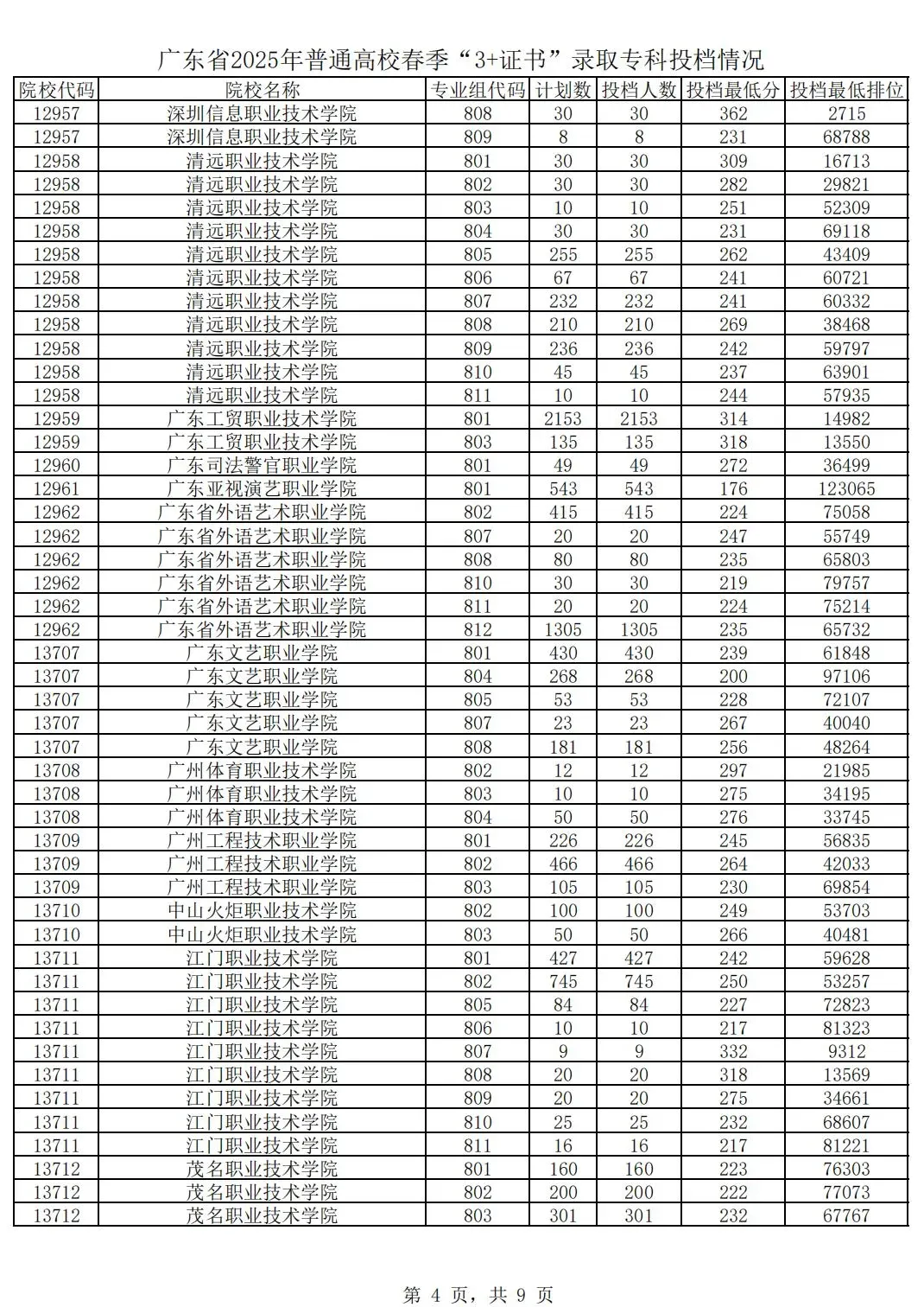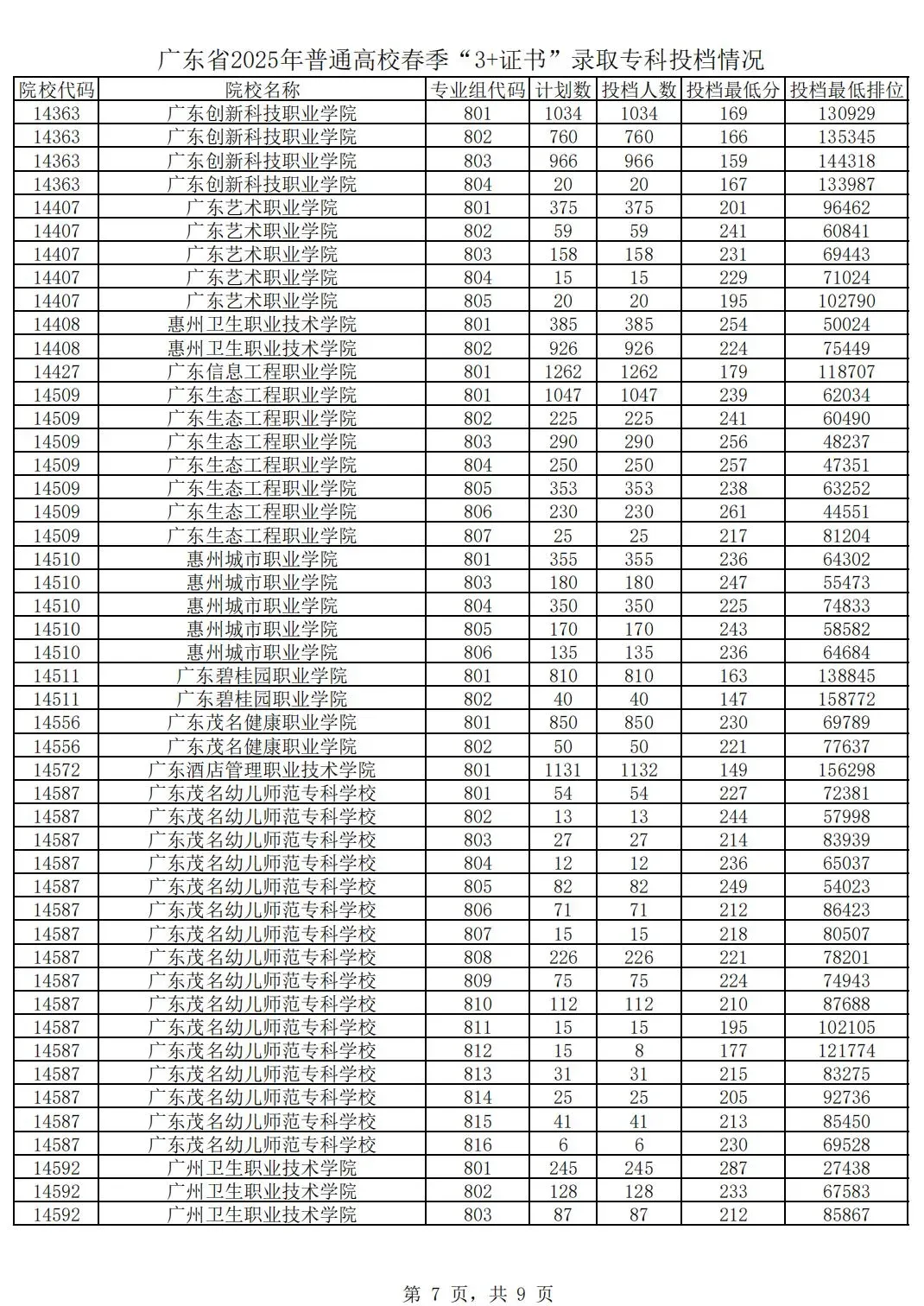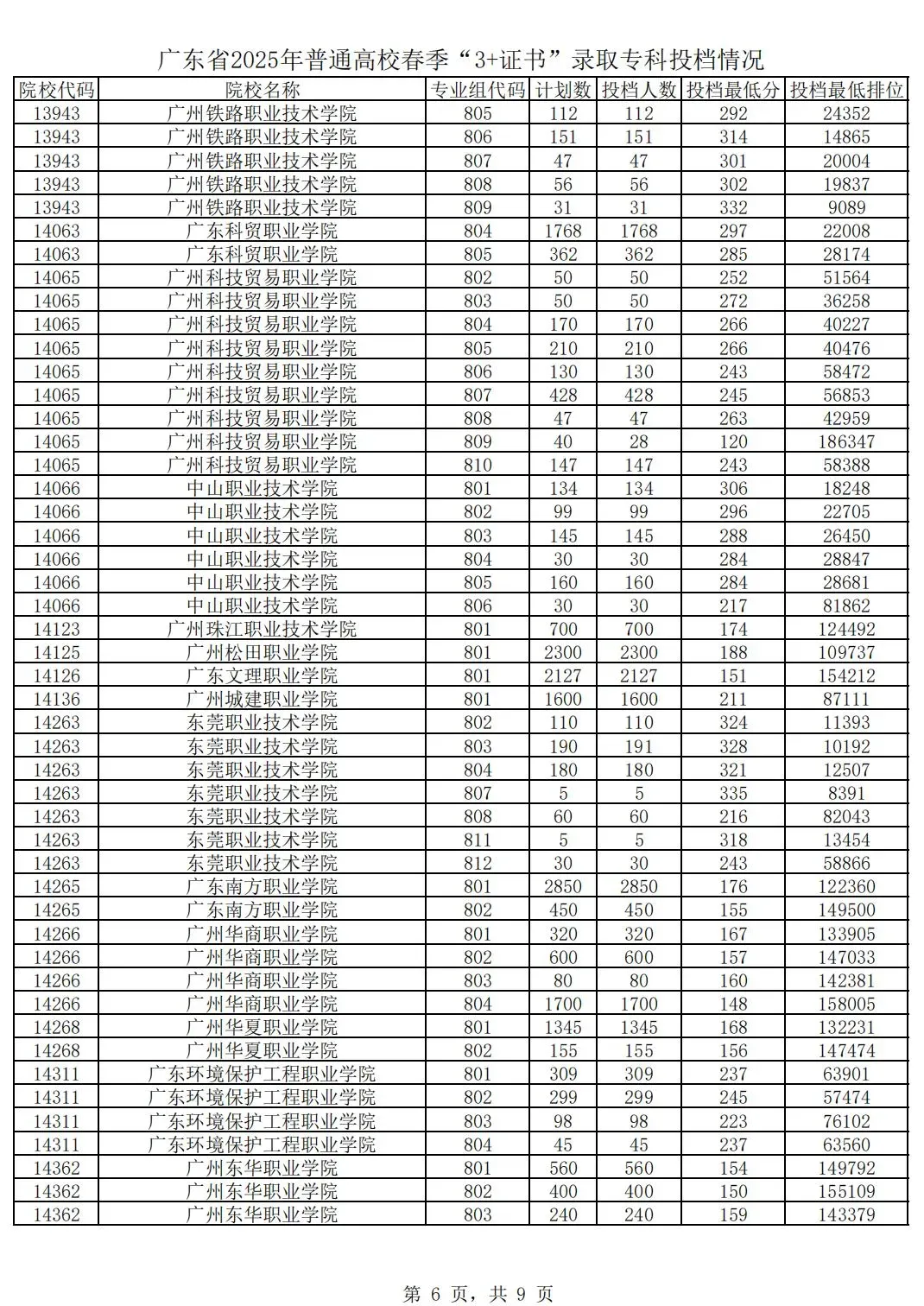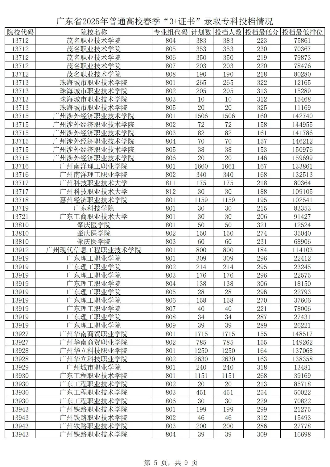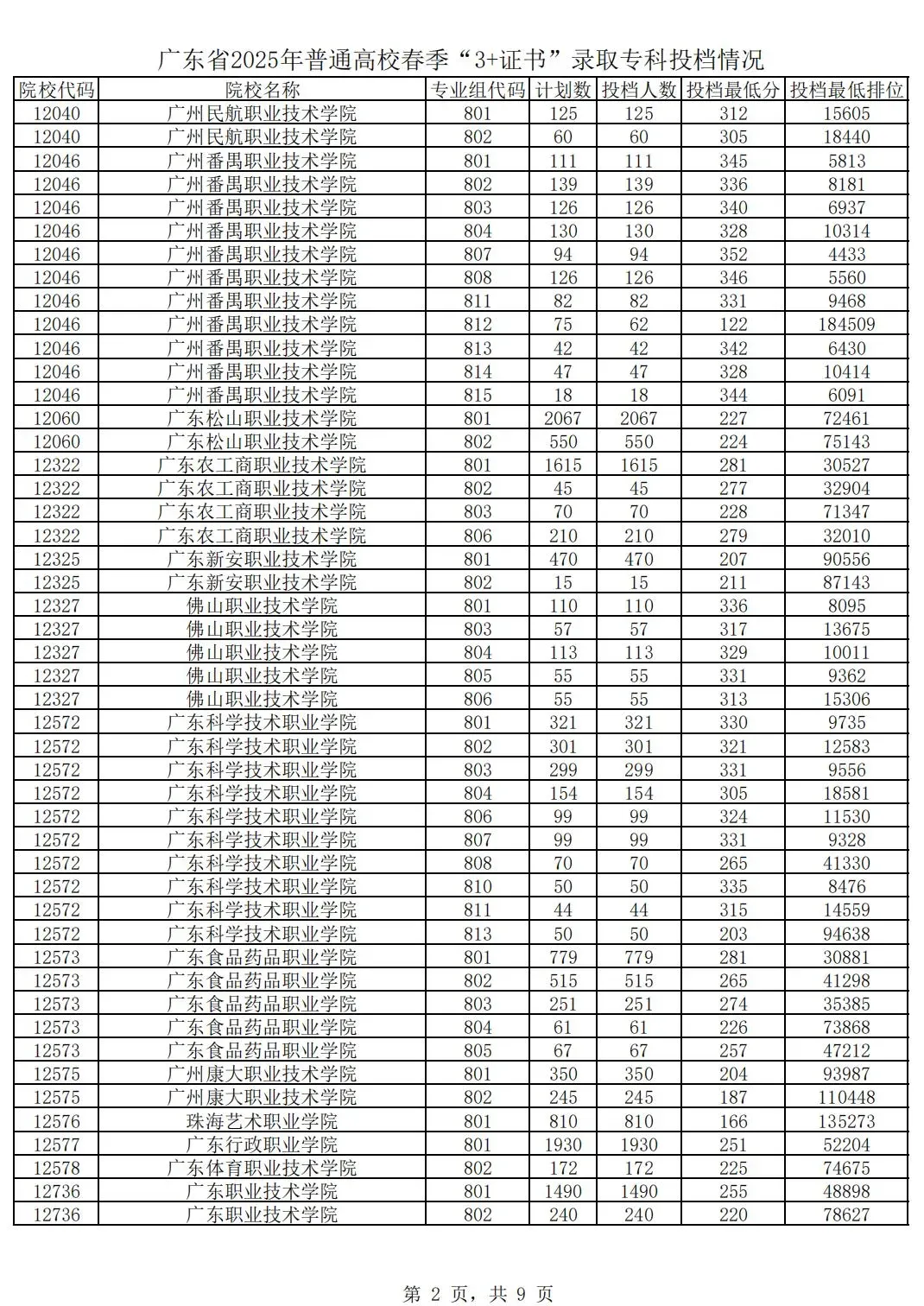 如果只是简单地参考去年的院校录取分数的话。很有可能会不准确,这个时候怎么办?同学们可以参照最低排位。如下图:在每年公布的院校分数线里都有一个最低排位。这里的最低排位就是指,该年所录取的排位最低的一个同学。虽然刚刚的讲的方法可以让你直接的参照到往年院校的最低排位,但是毕竟不直观。你很难去判断,你要稳上某所院校的话需要多多少排位。毕竟排位两千的时候,排位高一千。和排位两万的时候,排位高一千是完全两个概念的事。所以,我们要学会借助分数段将今年的分数大概换算成往年的分数。例如:你今年的排位是一万,那么你就要去25年的分数段里,找到25年一万排位是多少分,然后再去参考25年的录取分。2025年的广东3+证书分数段是“一分一段”,是以“1分”为单位,统计获得该分数内的考生人数和累计人数,每一个分数段上有多少人一目了然。分数段人数:指的是共有多少人得这个分数。比如:264分的人数为717人,表明我省共有717名考生得264分。累计人数:指的是这个分数段上的分数人数累加。比如264分累计人数为42354人,表明264分及以上的人数共有42354人。因为一年具有偶然性,很有可能出现大小年现象。所谓大小年就是指填报志愿的时候,因为前一年的分数过高,导致下一年的学校不敢填报这个学校,因此分数线又降低了,到了再下一年,因为前一年的分数过低,填报的人多了,分数又升高了。今年比起往年是否扩招,也是我们考虑学校分数是否会上涨的重要因素。不过由于目前公布招生计划的学校不多,这个数据比较难把握。要等三月份考试院的招生指南出来了才能确定。更多3+证书院校2026年招生计划,关注【广东中职生】公众号,回复“招生计划”查看!填志愿必备参考书