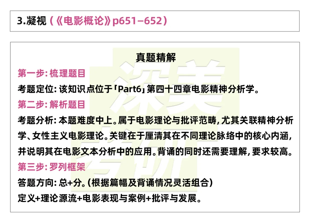 凝视是批判性电影理论与文化研究的关键概念,指携带权力结构与意识形态的观看方式,强调“看”与“被看”关系中隐含的支配、欲望、身份建构与认同机制。(定义)其理论脉络主要源自三方面:一是拉康的精神分析,将凝视视为他者对主体的象征性规训,一种令主体异化于自身形象的外在性力量;二是劳拉·穆尔维提出的男性凝视,指出经典好莱坞电影通过将女性身体景观化、客体化,使之成为满足男性观众欲望与权力幻想的对象,从而再生产了父权制的视觉秩序;三是后殖民理论中的他者凝视,揭示并批判西方中心视角如何将东方文化奇观化、刻板化为被动的“他者”,以此巩固文化霸权。(源流与分类)在影视创作中,凝视通过视听语言实现:主观镜头使观众代入凝视者位置;特写与展示性构图强化被观看客体的身体或异域特征;视线匹配剪辑则自然化叙事内部不平等的观看关系,使权力结构隐形。(创作应用)