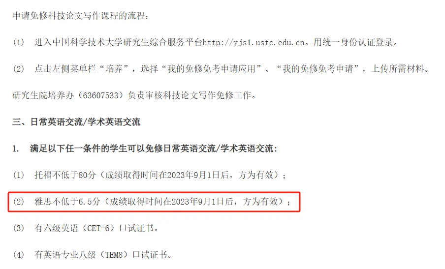 绝大多数国内院校都设有《研究生英语课免修规定》,雅思/托福成绩达到学校要求的成绩可申请免修免考研究生期间英语课程并获得相应学分。例如中国科学技术大学表示,雅思达到6.5分可免修英语!
