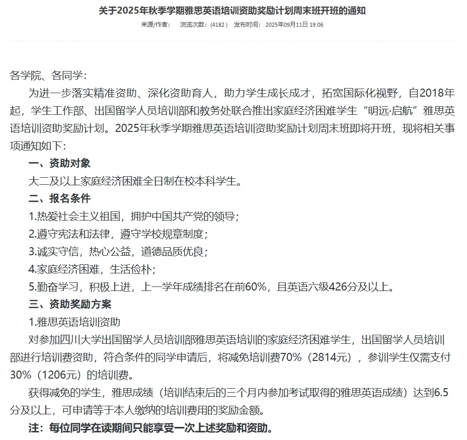 为了激励学生提升英语,四川大学开设雅思激励奖学金,不但减免培训费,达到6.5分及以上,还能再申请奖励金,轻轻松松赚回学费,还能熟练掌握一门语言!