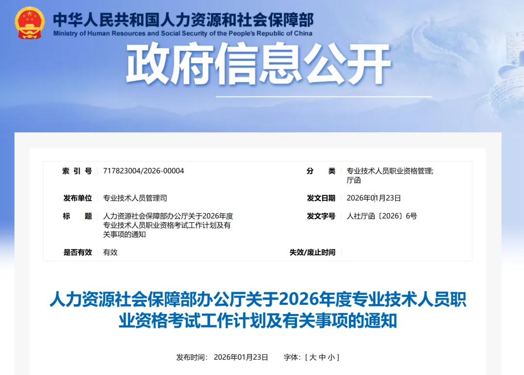 人社部官网发布了《人力资源社会保障部办公厅关于2026年度专业技术人员职业资格考试工作计划及有关事项的通知》。