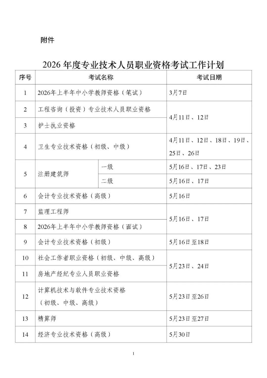 为切实做好专业技术人员职业资格考试规划与管理工作,方便广大专业技术人员参加职业资格考试,经征求有关部门同意,现就2026年度专业技术人员职业资格考试工作计划及有关事项通知如下: