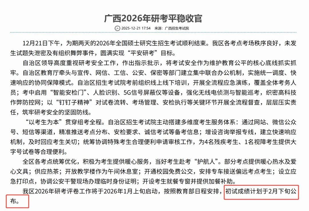 广西省教育考试院发布公告称:“初试成绩计划于2月下旬公布。”