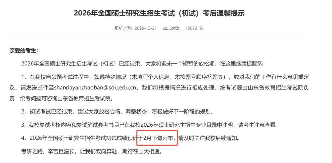 山东大学研究生招生信息网发布公告称:“初试成绩将于2026年2月下旬公布。”