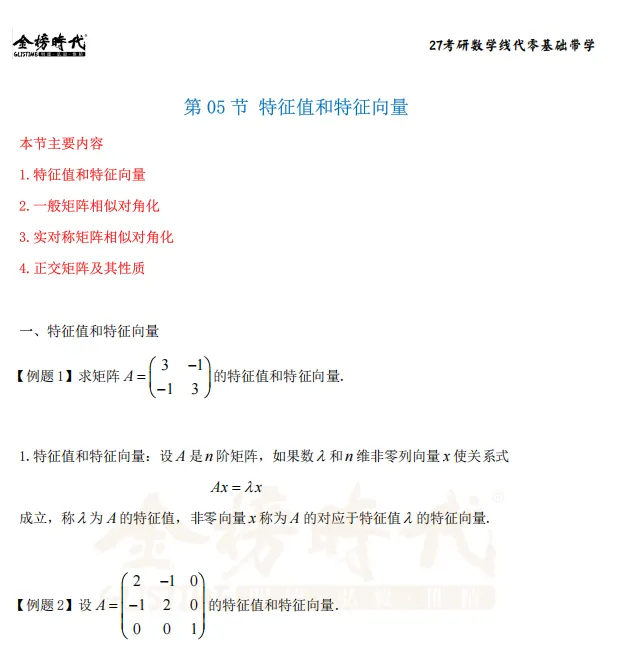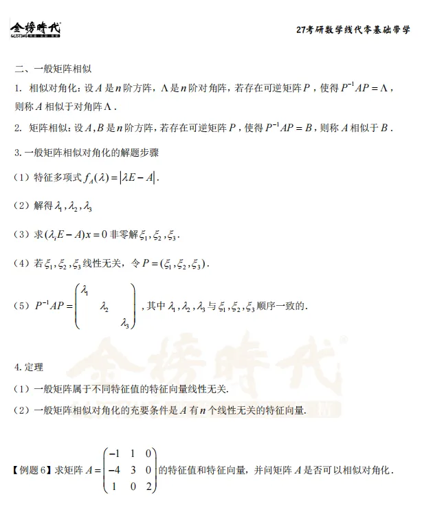 ●明确“一般矩阵对角化”和“实对称矩阵正交对角化”的条件和差异。