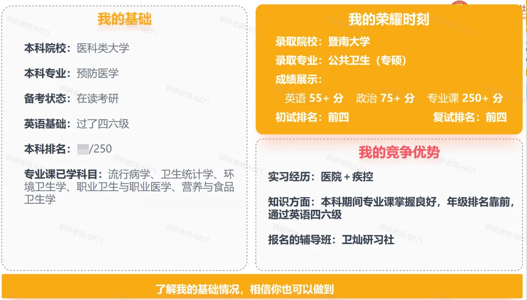 🟡卫灿·卫灿资深考研择校顾问🟡讲师简介:专注公共卫生专业择校6年,致力于为考研人寻找最佳目标院校,从源头提升上岸率,时间、效率、过线,三手抓,三手都硬!