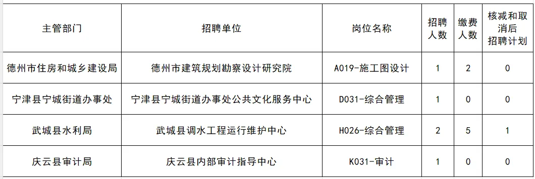 2026年度德州市事业单位初级综合类岗位公开招聘报名工作已于2026年2月1日16时结束。根据中共德州市委组织部、德州市人力资源和社会保障局《2026年度德州市事业单位公开招聘初级综合类岗位人员公告》规定,应聘人数达不到规定比例的招聘岗位,计划招聘1人的,取消招聘岗位;计划招聘2人以上的,按规定比例相应核减招聘人数。现将核减和取消招聘计划情况予以公告。