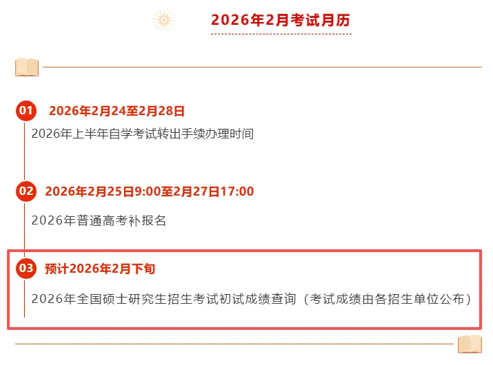 江西省发布2月考试月历,2026年全国硕士研究生招生考试初试成绩预计将于2月下旬公布。