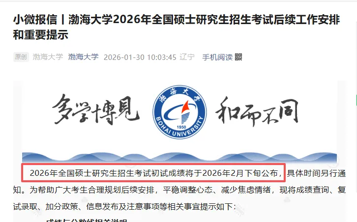 渤海大学公众号发布,初试成绩将于2月下旬公布。