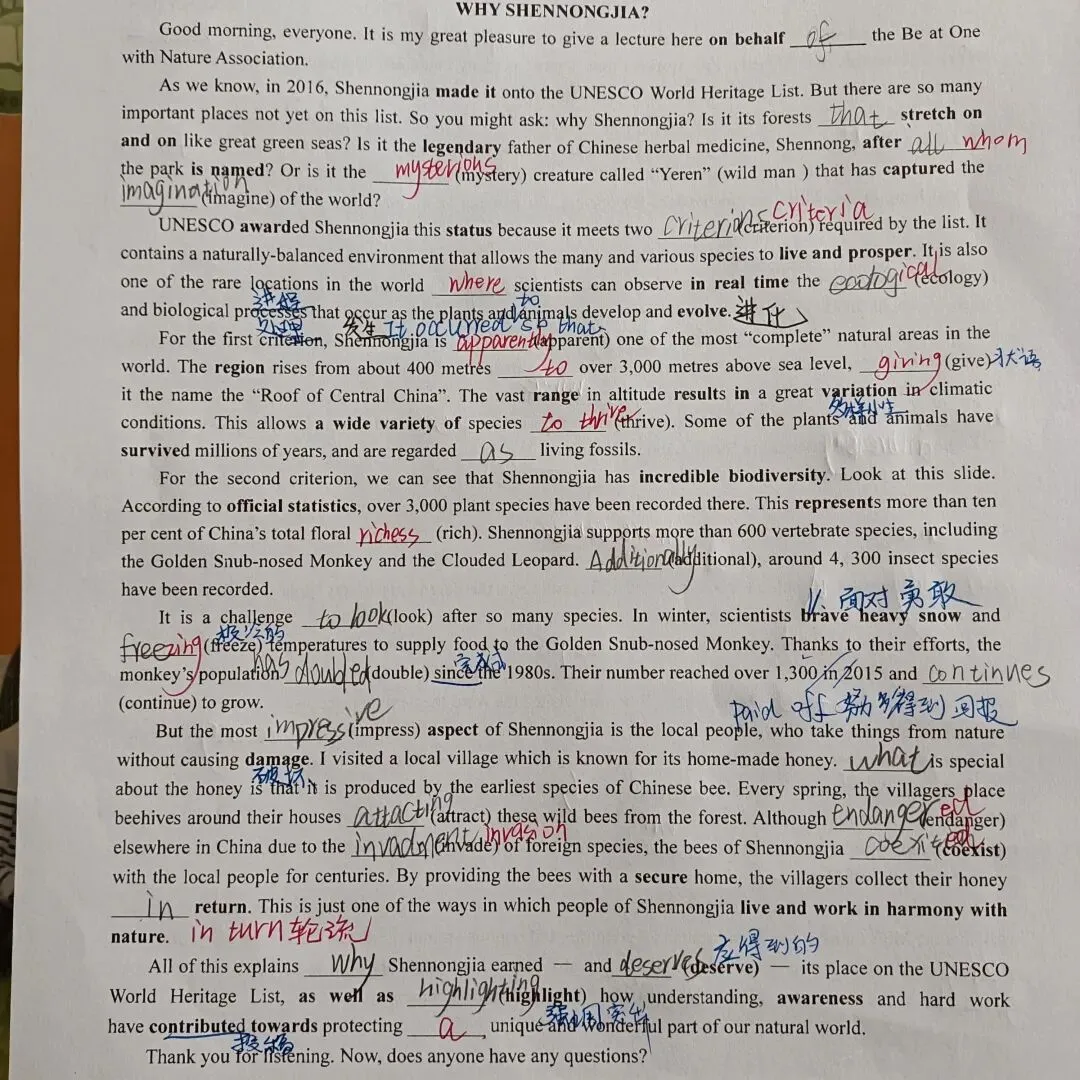 《Unit 5 Why Shennongjia?》,填空结束后,我让学生们依次读,并提问个别空格的原因及某些重难点的拓展。 如,imagine的名词,survive/arrive的名词,variation的动词及形容词,represent的相近词(account for)、occur的补充句型(某人突然想起)。
