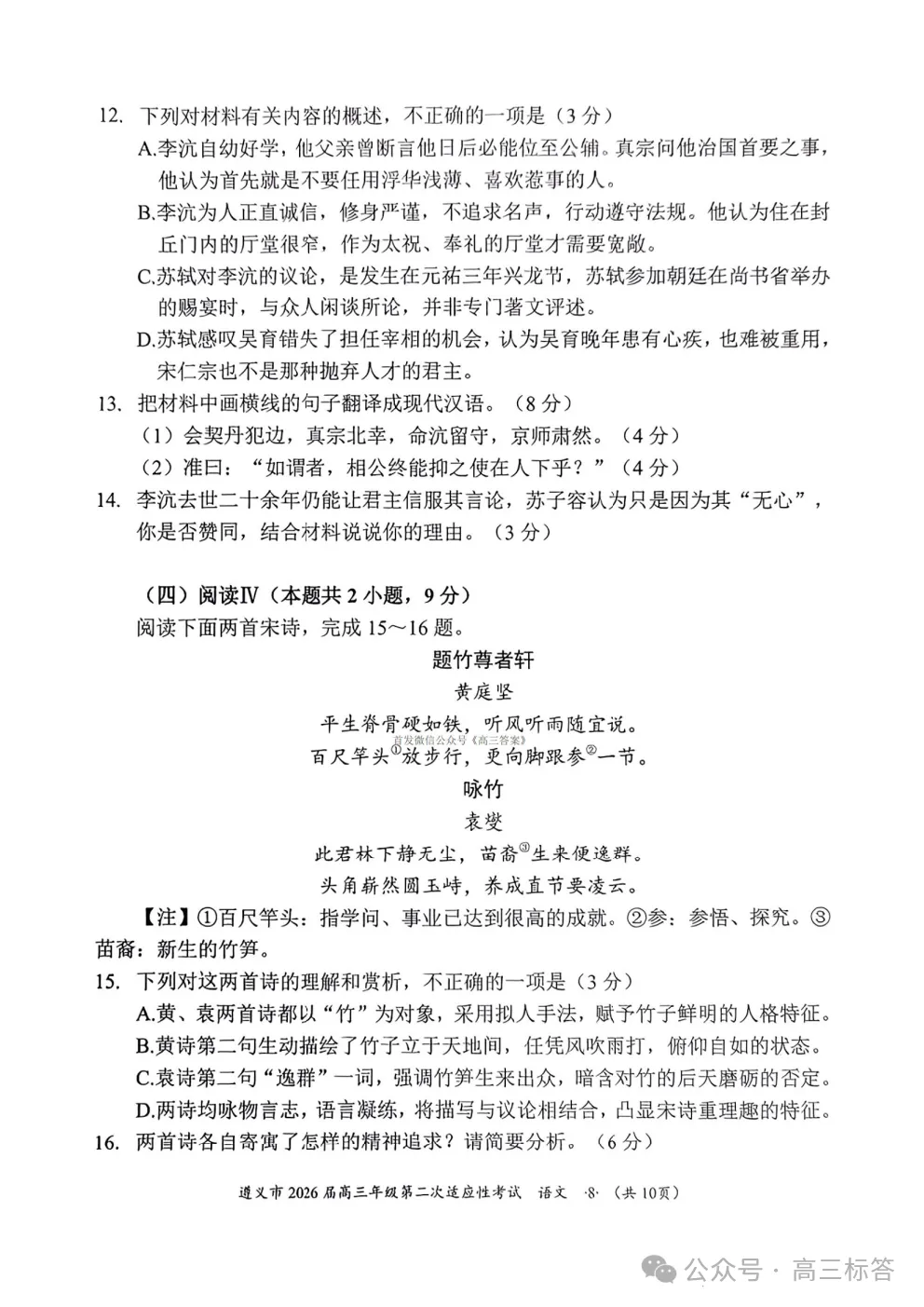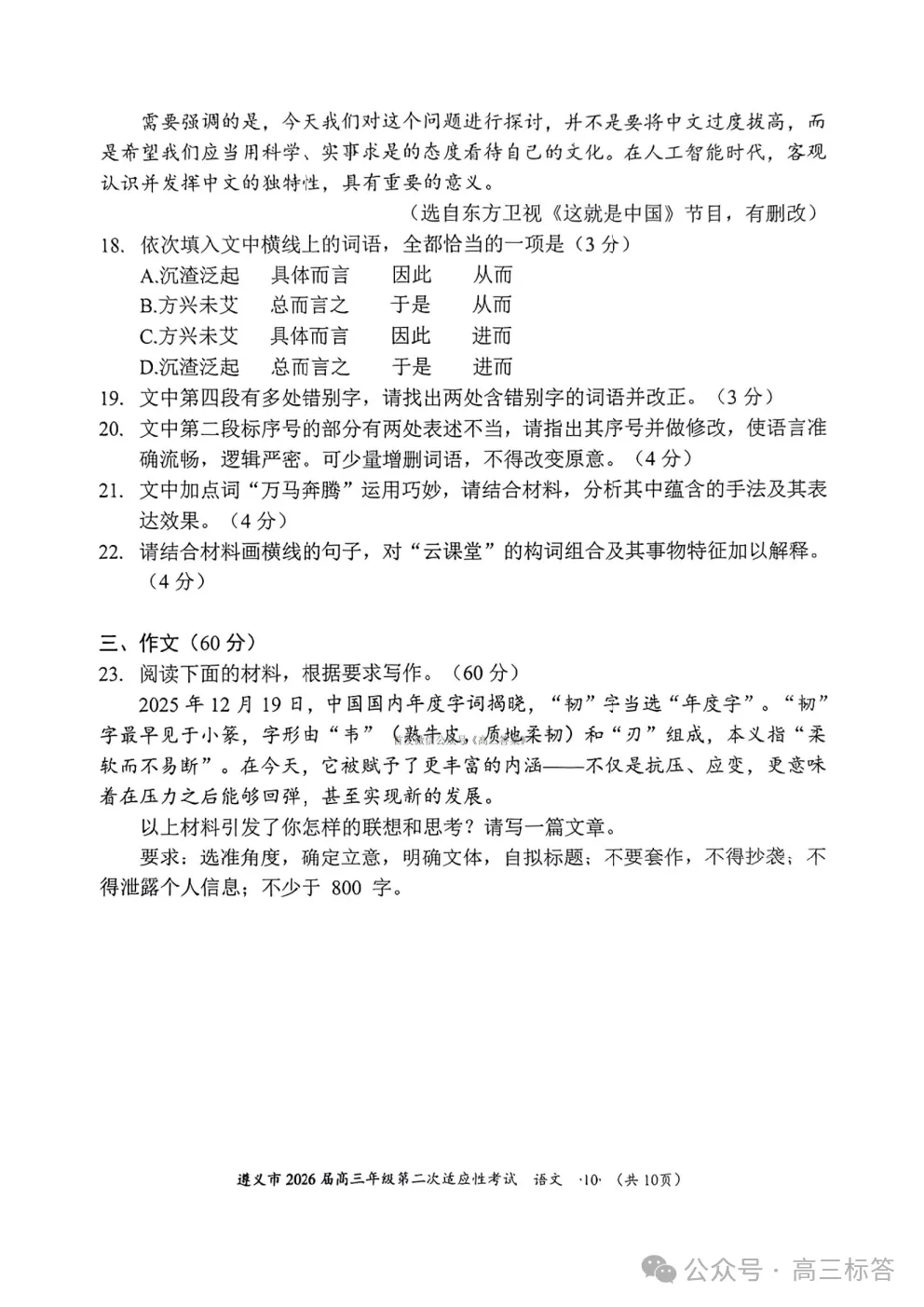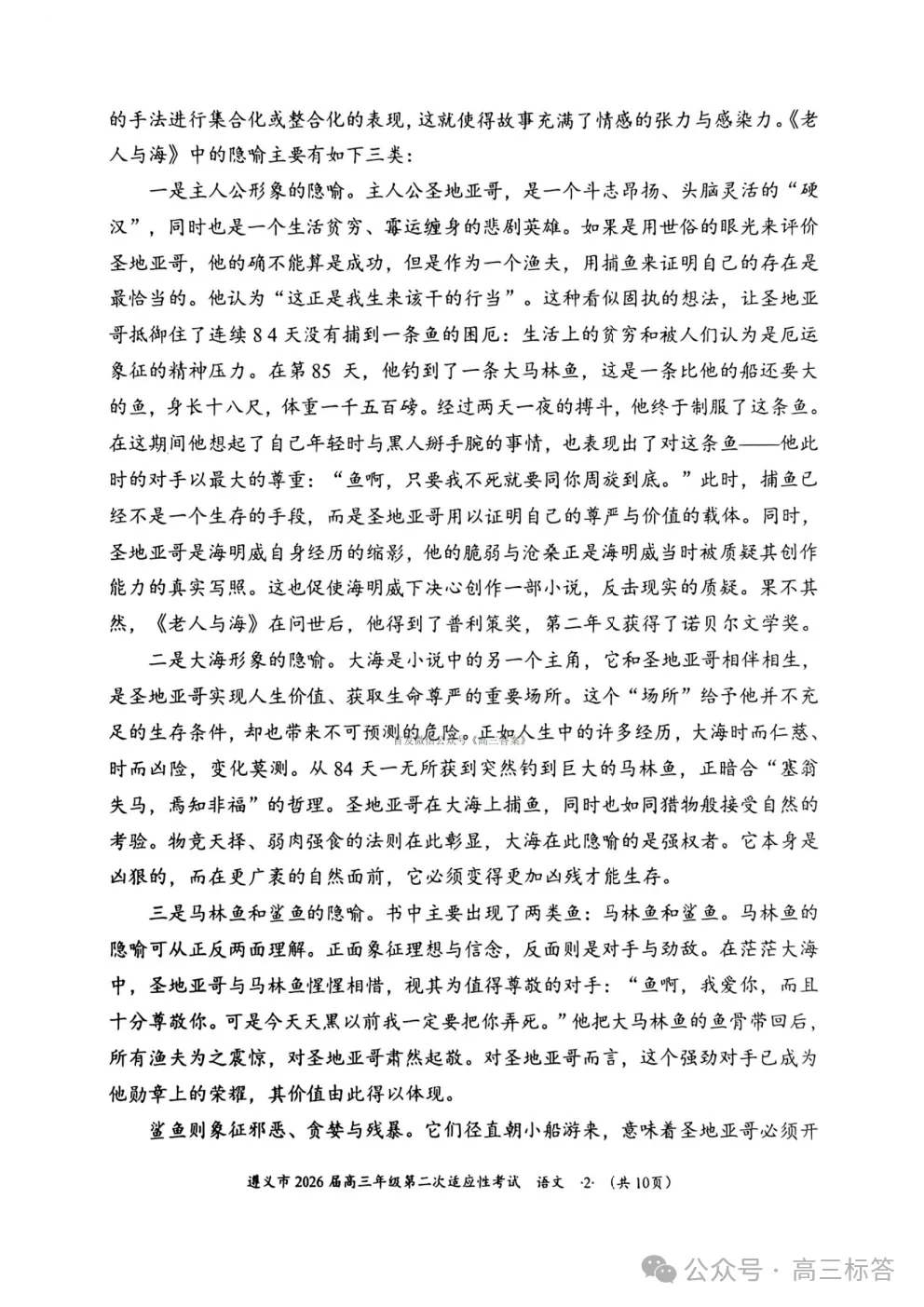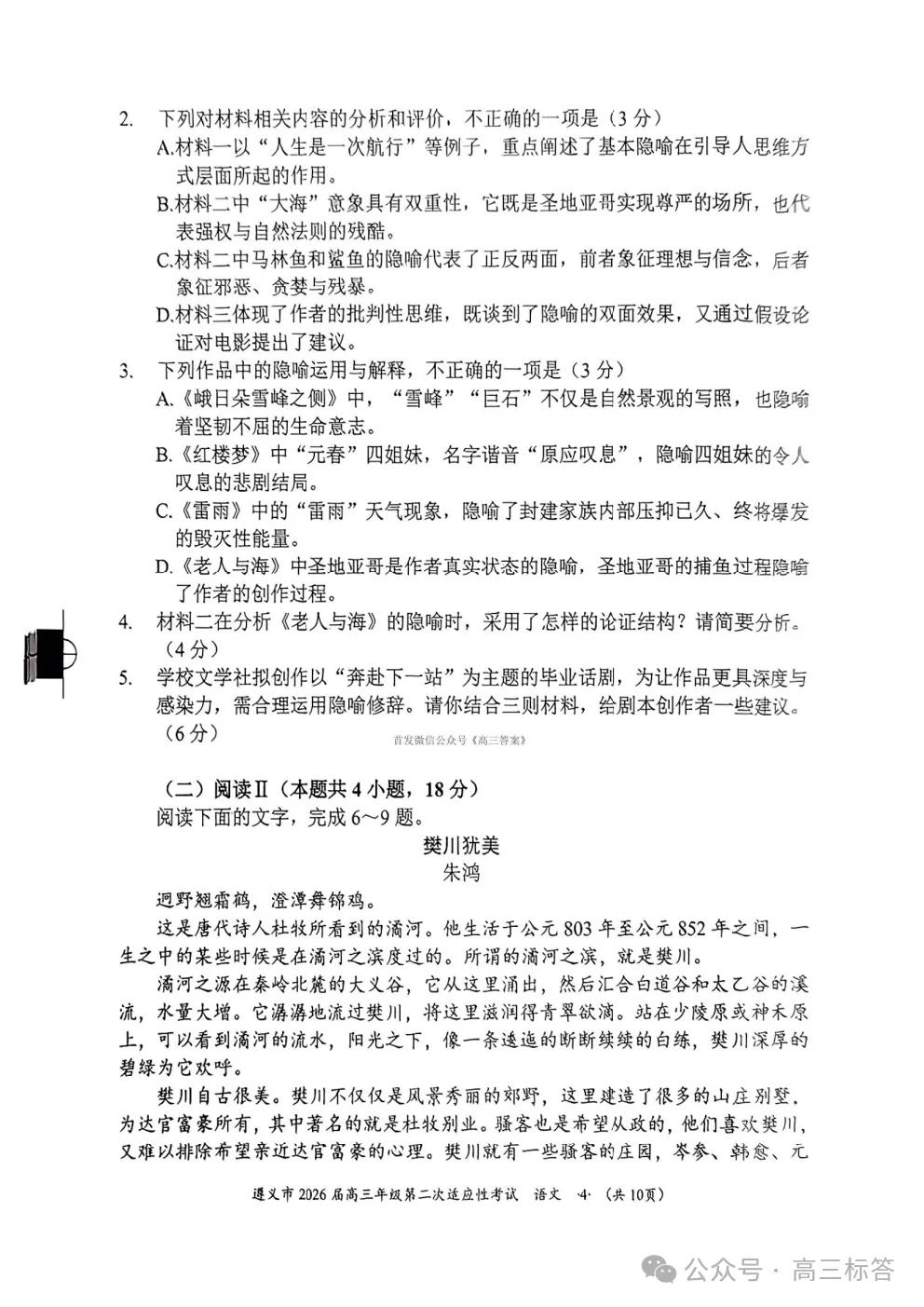 遵义市2026届高三年级第二次适应性考试语文答案