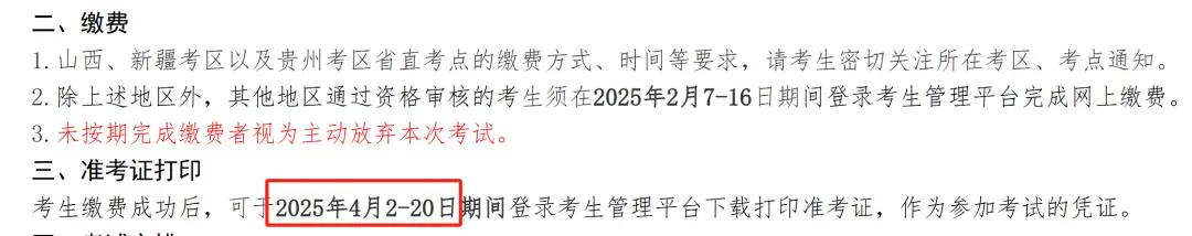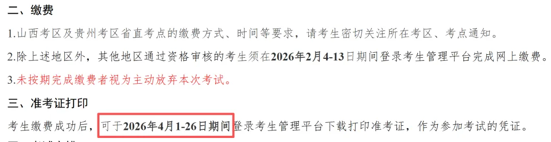考生缴费成功后,可于2026年4月1-26日登录考生管理平台下载打印准考证,作为参加考试的凭证。