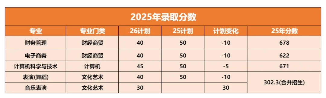 发布了2026年面向中职对口升学招生计划,相比2025年,电子商务和财务管理各减少10人、计算机科学与技术减少 5 人,舞蹈表演和音乐表演共计 70 人,相比 25 年增加 20 人。会继续跟踪后续。具体如下: