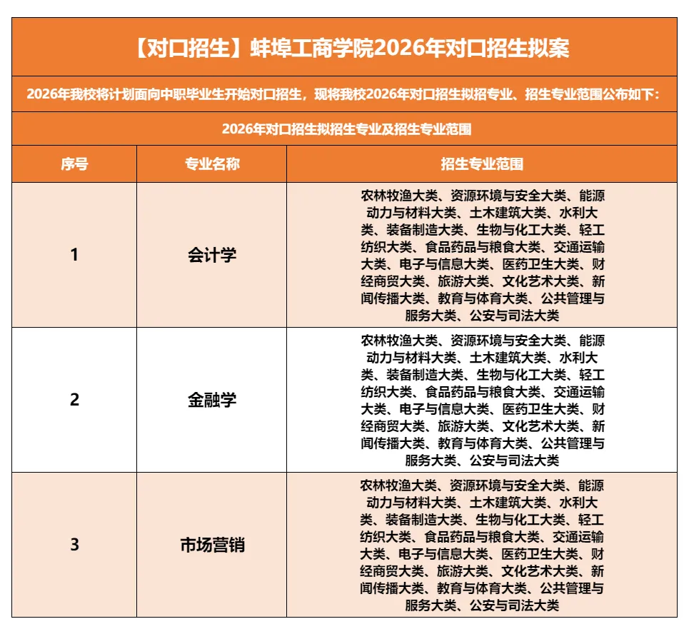 2026 年安徽省中职对口升学招生动态持续更新!目前已有十余所院校公布对口升学计划或拟招生专业,整体呈现 “总计划缩减、部分专业迭代” 的特点 —— 多所院校停招传统专业,同时新增贴合市场需求的新兴专业。以下为最新汇总信息,所有计划均来自院校官方通知,最终以安徽省教育厅审核下达为准,供广大考生及家长参考!