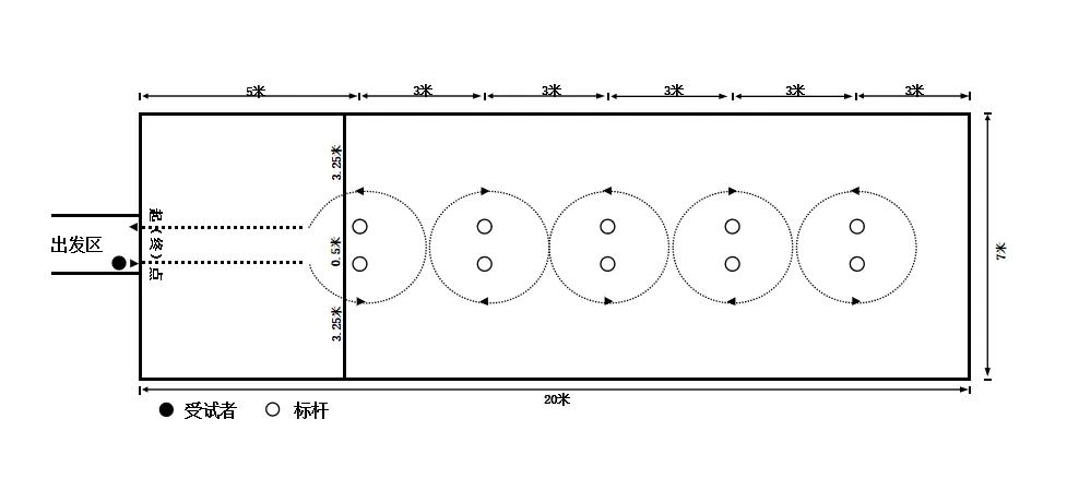 场地设置在球场内或者平整的塑胶场地上。设置要求:长20米,宽7米。起点线前5米处开始设置标志杆,共设5排,每排2根;各标志杆之间相距3米,同排的两根标志杆底座中心点之间相距0.5米,距同侧边线3米。起点线中间1米处为出发区域。
