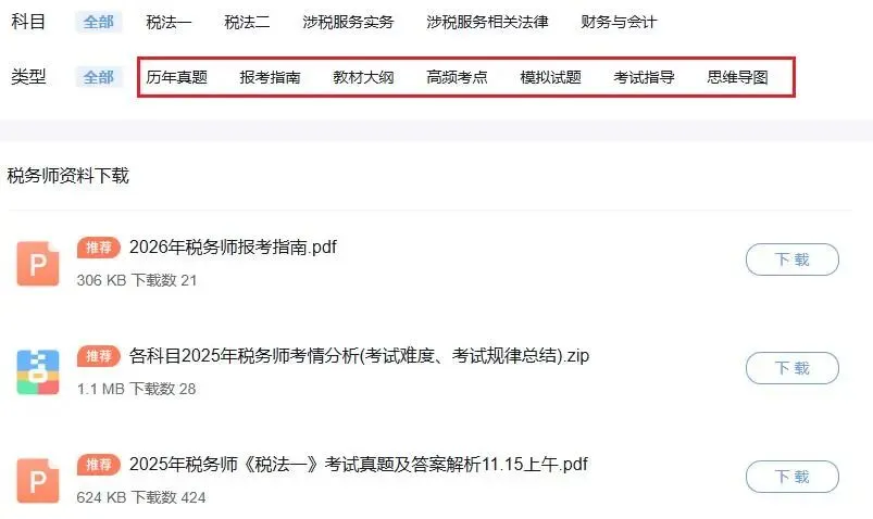 在备考过程中,考试大纲、教材解读、历年真题、高频考点、经典模拟题等重要资料是十分重要的,大家可以点击进入>>>税务师备考资料页面,或点击下方图片,免费下载自己所需资料。