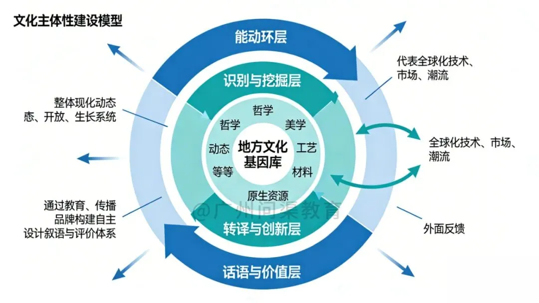 该图由一个核心圆与三个环绕的能动环层构成。最内层的核心圆代表“地方文化基因库”,包括哲学、美学、工艺、材料等原生资源。其外的第一能动环是 “识别与挖掘层” ,箭头从核心圆指向此环,表示挖掘过程。第二环是 “转译与创新层” ,此环与代表全球化技术、市场、潮流的外部区域有双向箭头交互,表示在开放中进行创造性转化,并将创新成果反馈回核心,丰富基因库。最外第三环是 “话语与价值层” ,它向外辐射,代表通过教育、传播、品牌构建自主的设计叙事与评价体系。三个环层围绕核心循环互动,形成一个动态、开放、生长的系统,直观表明文化主体性是在积极的“识别-转译-建构”循环中得以保持和强化的,而非静态的固守。