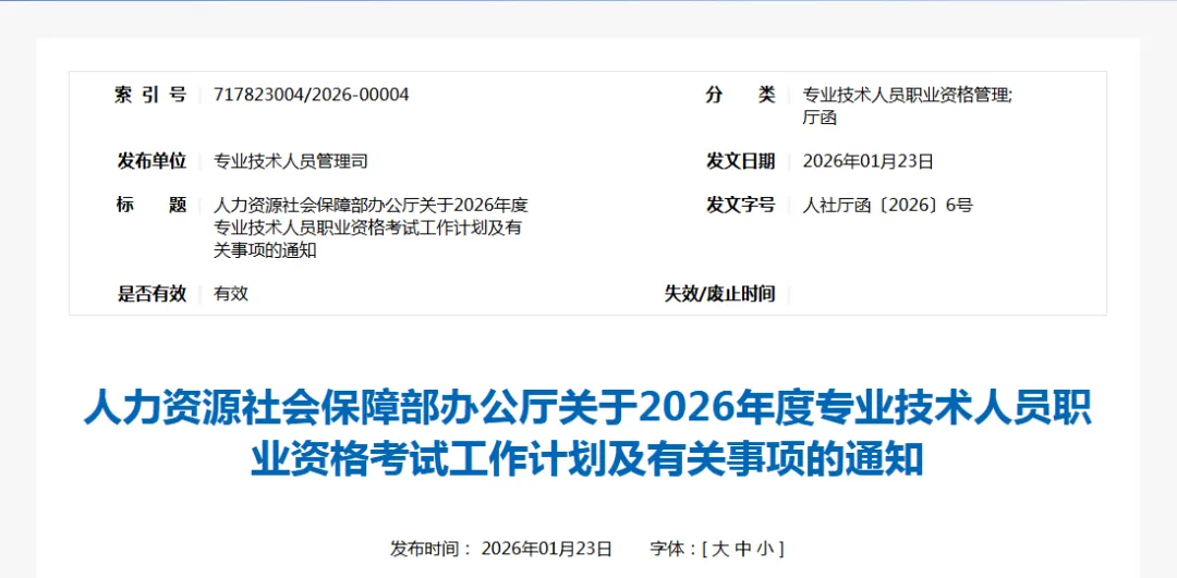 为切实做好专业技术人员职业资格考试规划与管理工作,方便广大专业技术人员参加职业资格考试,经征求有关部门同意,现就2026年度专业技术人员职业资格考试工作计划及有关事项通知如下:
