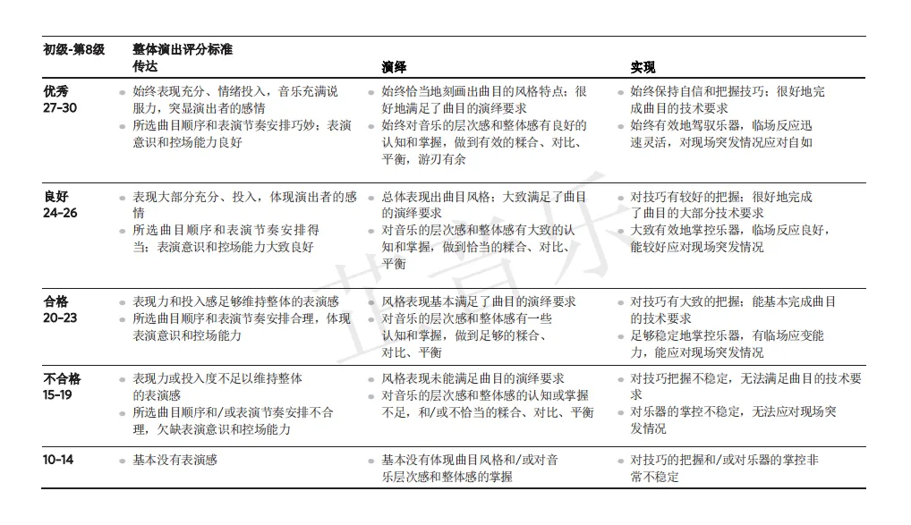 线上演奏考试整体成绩等级划分