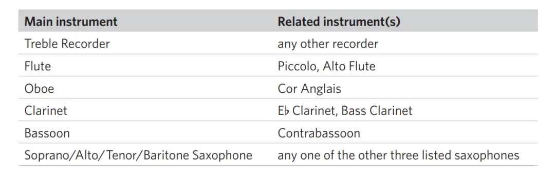 1-3级:考生最多可以演奏两首有管乐伴奏的作品(在考纲列表上标记为DUET或管乐伴奏),而4-8级则只允许最多选择一首。
