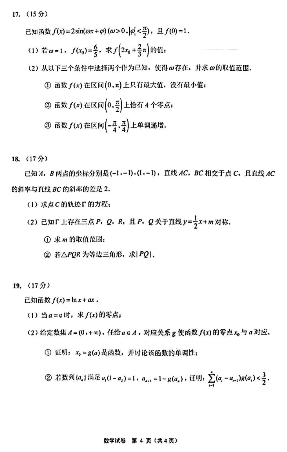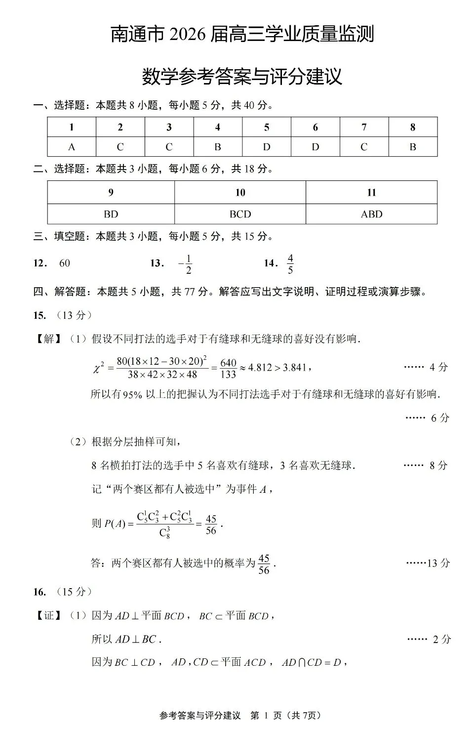 >南通市2026届高三上学期期末考试数学试题+参考答案