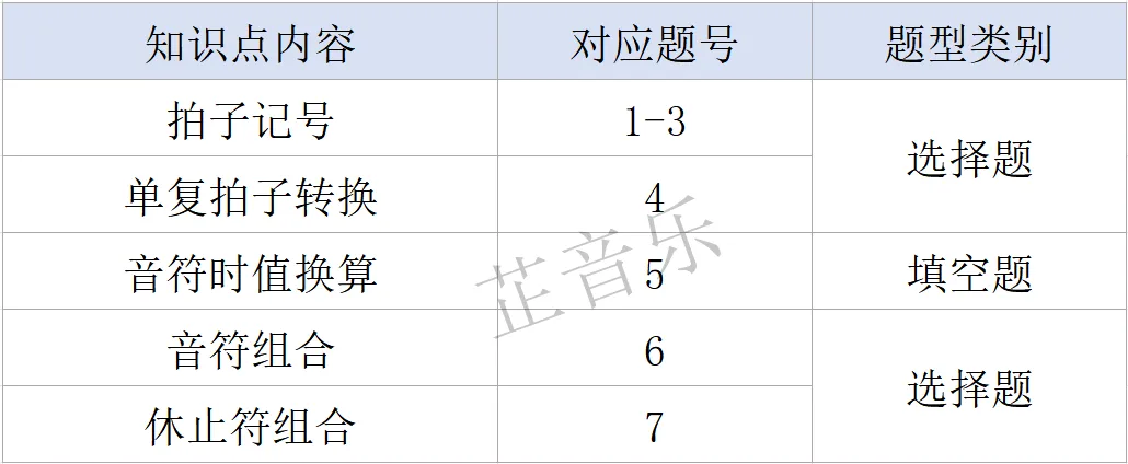 主要考查知识点:音符时值、单复拍子及拍子转换、音值组合等。