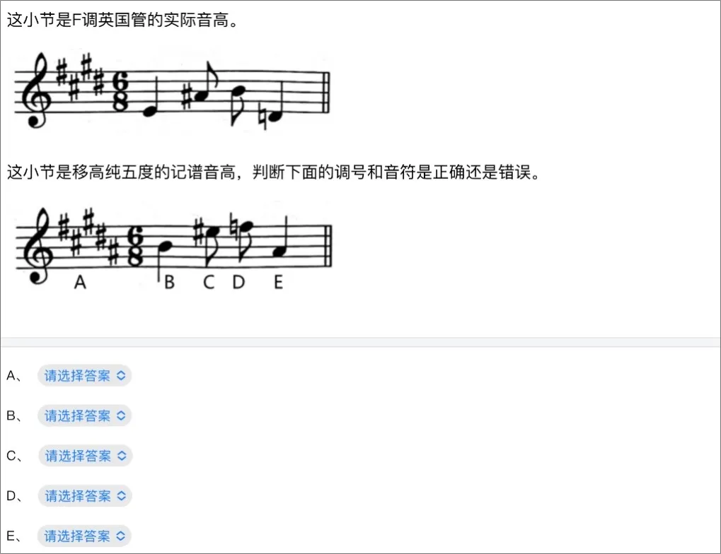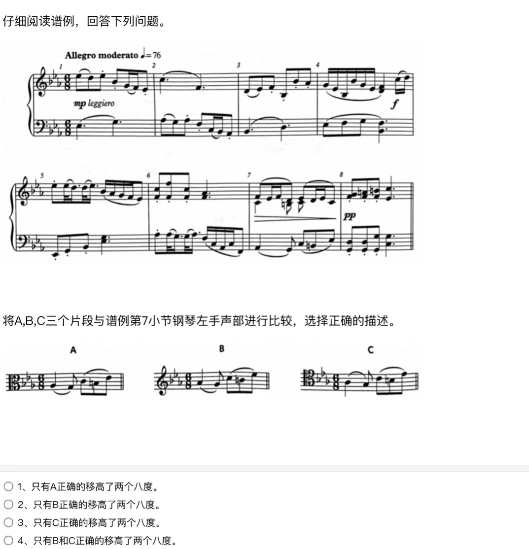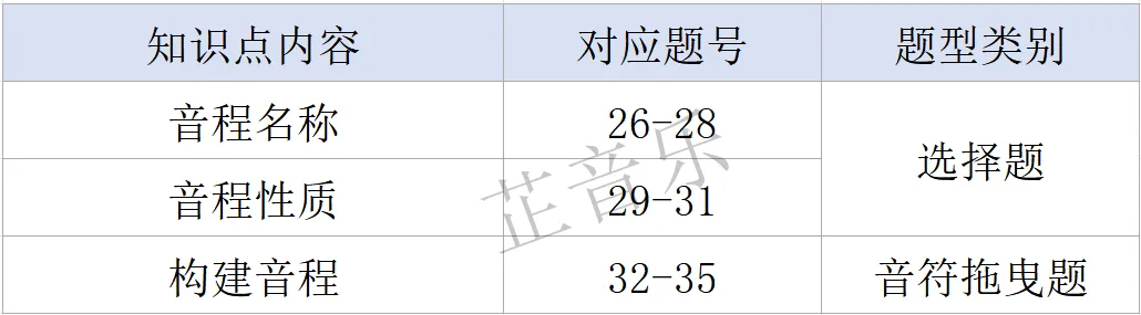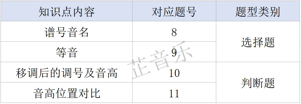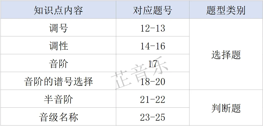 主要考查知识点:四个谱号上的调号、自然大小调、和声小调及旋律小调音阶及名称、任意音开始的半音阶等。
