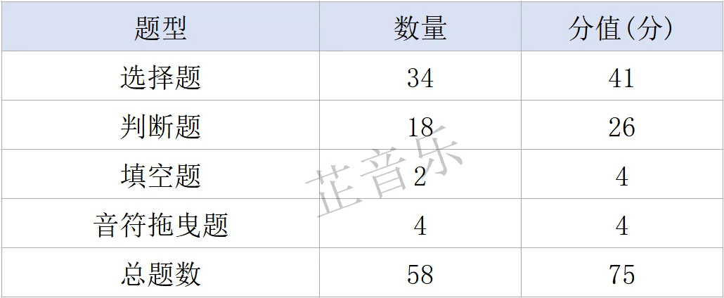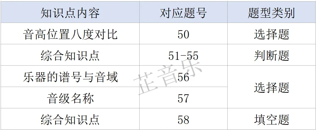 主要考查知识点:1-5级常用音乐术语、装饰音、乐器组的乐器及人声分类的特点及音域等。