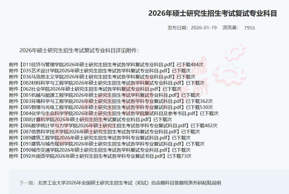 https://yzb.tju.edu.cn/xwzx/zxxx/202601/W020260126339326677949.pdf北京工业大学1月19日发布了2026年硕士研究生招生考试复试专业科目。