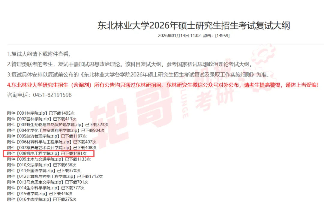 东北林业大学1月14日发布了2026年硕士研究生招生考试复试大纲。