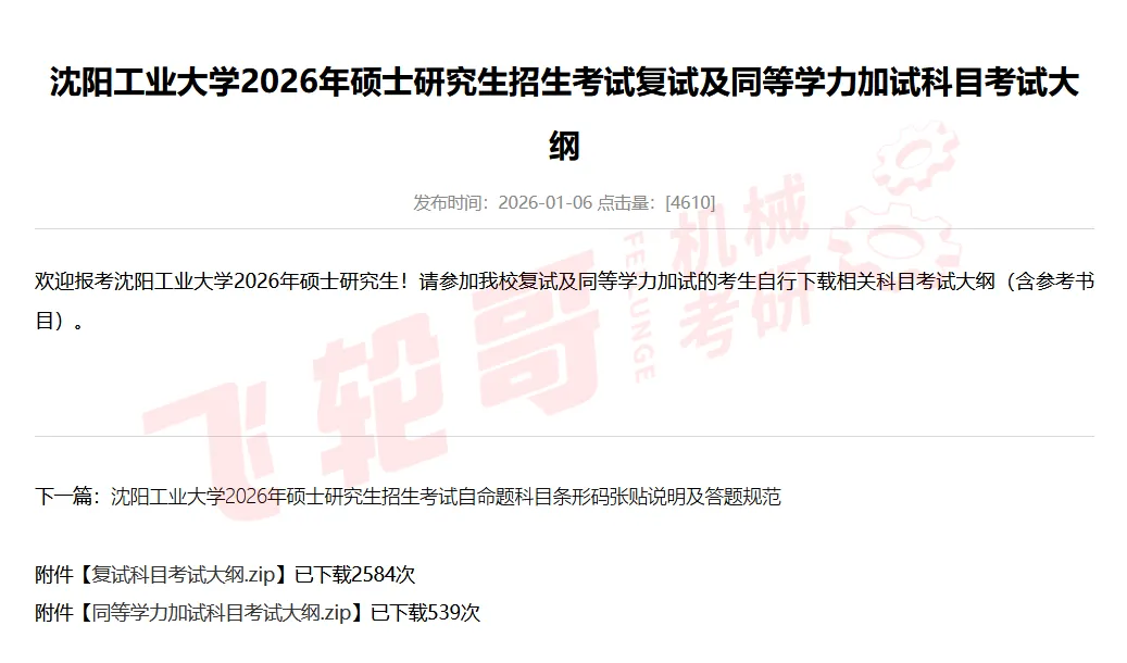 沈阳工业大学1月6日发布了2026年硕士研究生招生考试复试及同等学力加试科目考试大纲。
