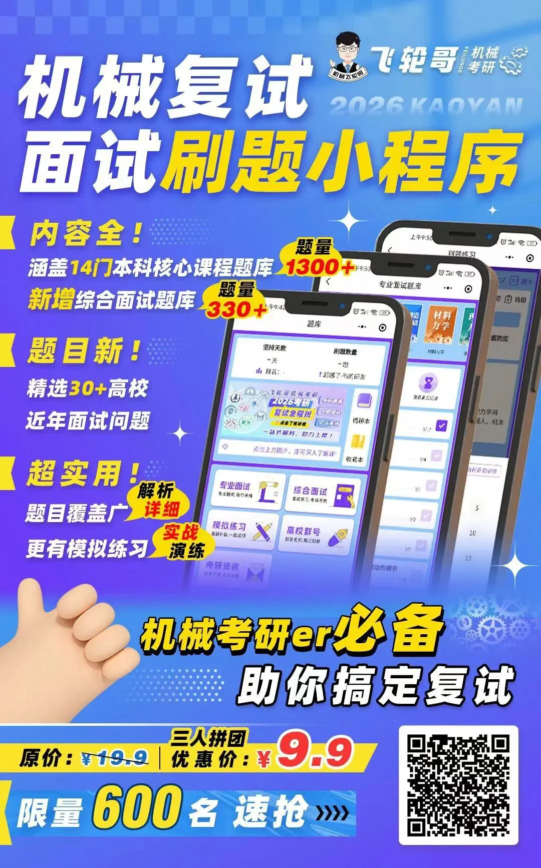 我的【机械考研复试面试刷题小程序】已经上线了,包含机原、机设、材力、机制等14门机械专业本科阶段核心课程题库,精选1300多道题。今年新增综合面试题库,题量330+,覆盖全面,解析详细!需要同学扫码下方二维码!