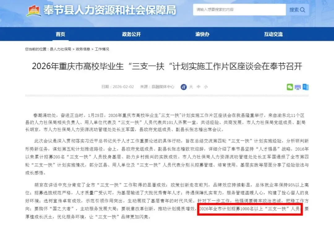 近日,2026年重庆市高校毕业生“三支一扶“计划实施工作片区座谈会在奉节召开,会议指出:2026年全市计划招募1000名以上“三支一扶”人员。