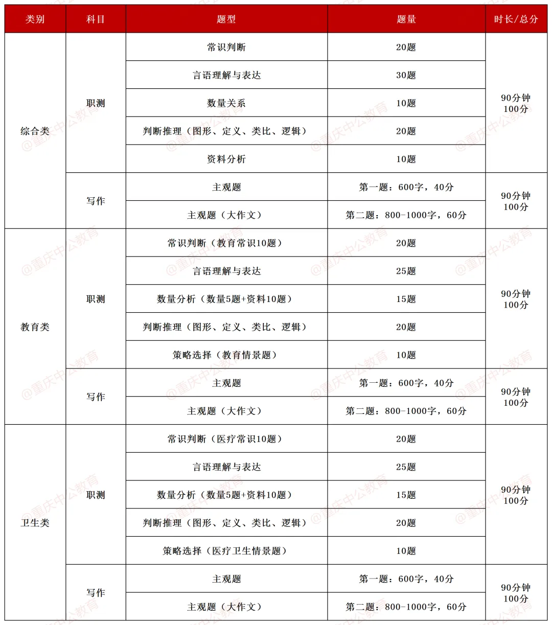 重庆三支一扶笔试科目包括《职业能力倾向测验》和《写作》两科,笔试总时长为90分钟,满分均为100分/科。>>点击领取重庆三支一扶历年试题