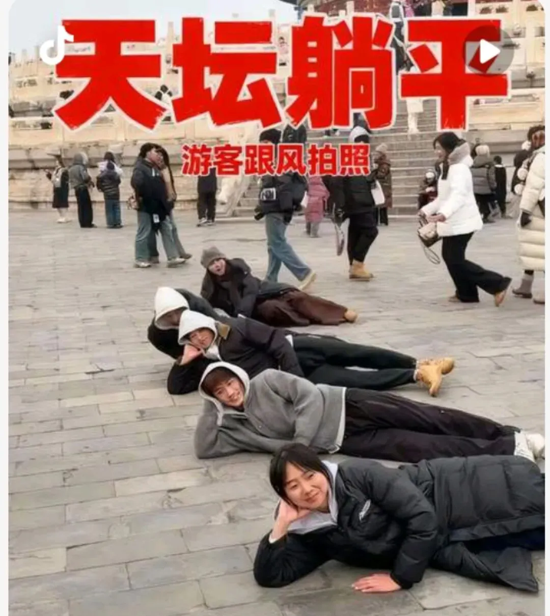 北京天坛的丹陛桥上,红墙金瓦映着蓝天,数十名游客以地为席,整齐躺成一列,镜头对准祈年殿按下快门。这一幕没有导演、没有脚本,只是一名考研男生的随性一躺,却在20分钟内引发陌生人的自发跟风,相关视频在社交平台斩获千万播放,#天坛随地大小躺#的话题更是掀起全网热议。