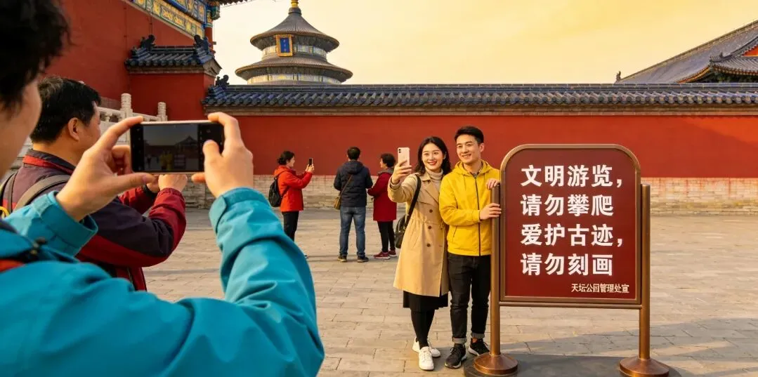 面对争议,天坛公园管理处也及时作出回应:支持游客文明创意打卡,但禁止在文物本体上躺卧。丹陛桥作为核心文物保护范围,不适合进行此类集体躺拍行为,游客可在周边的公共广场等非文物区域,进行创意拍摄。这一回应,既守住了文物保护的底线,也给了年轻人创意表达的空间,清晰划定了“个性表达”与“文物保护”的边界。