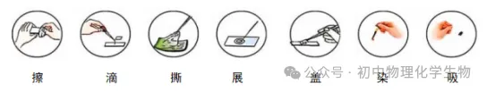 (4)盖:用镊子夹起盖玻片,使其一边先接触载玻片上的水滴,然后缓缓放下,目的是避免盖玻片下出现气泡;